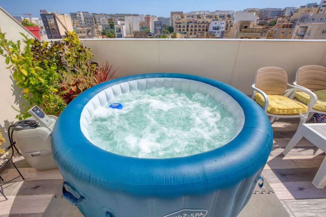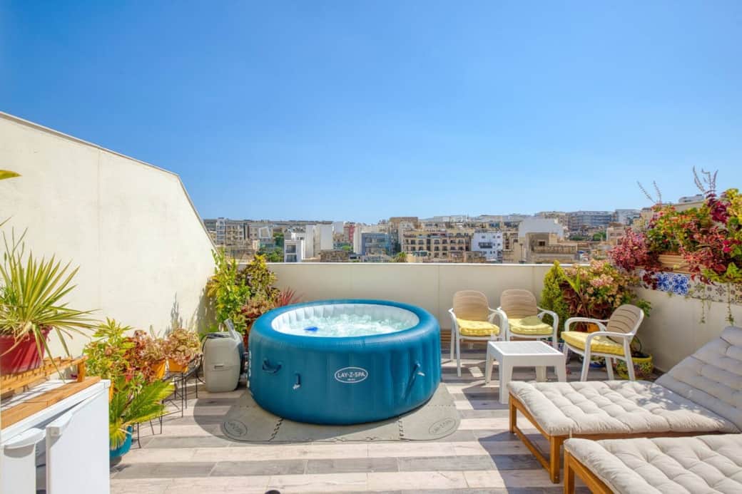 • Back balcony overlooking gardens and pools with views of the Church and Valletta